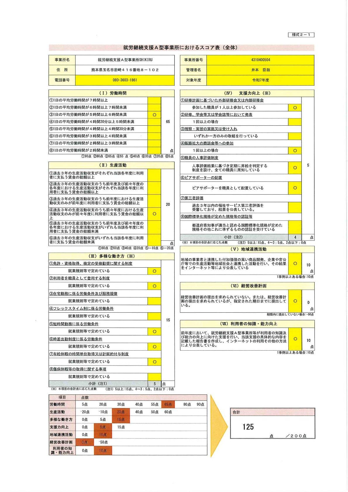 令和7年度 就労継続支援A型事業所SHIKIRUスコア(評価点)